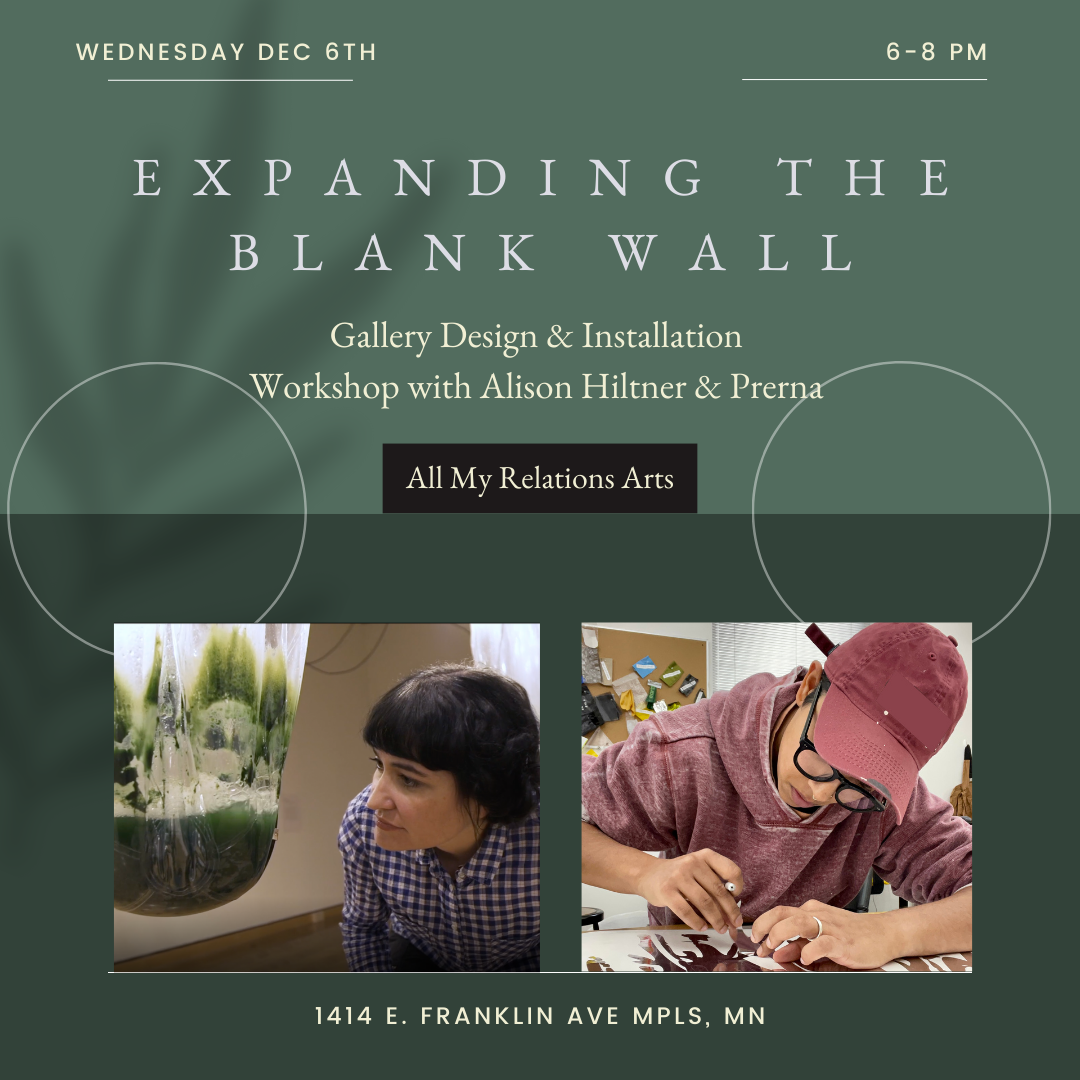Join AMRA and NACDI on Wednesday, Dec. 6th as we welcome artists/curators/installers Alison Hiltner (SooVAC) and Prerna for a visionary workshop on gallery design and installation. Bring images, videos, or drawings to share a specific installation challenge you have with your practice, and Alison Hiltner and Prerna will share their problem-solving processes with you. Get hands-on experience on gallery design & install and learn what it takes to turn a blank wall into a visually-appealing exhibition space.