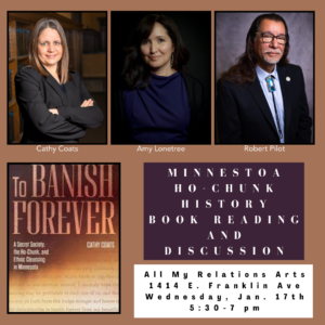 Join All My Relations Arts and the Minnesota Historical Society Press as we present an evening delving into the often erased and excluded Minnesota history of the Ho-Chunk Nation. The night will feature a discussion between Ho-Chunk citizens Robert Pilot and Amy Lonetree, followed by a reading and Q&A with historian Cathy Coats, author of To Banish Forever: A Secret Society, the Ho-Chunk, and Ethnic Cleansing in Minnesota.