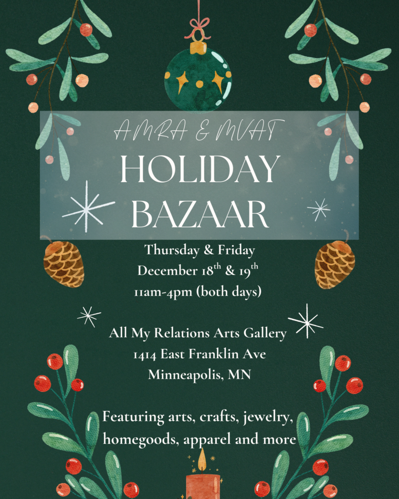 Join MVAT and AMRA Thursday, December 18th and 19th as we team up for a two-day holiday bazaar. Featuring arts, crafts, jewelry, homegoods, apparel and more from 10+ local Native vendors. Grab your last minute holiday gifts, enjoy complimentary warm beverages from Pow Wow Grounds Coffee and win raffle prizes happening throughout the day.Featured Vendors: