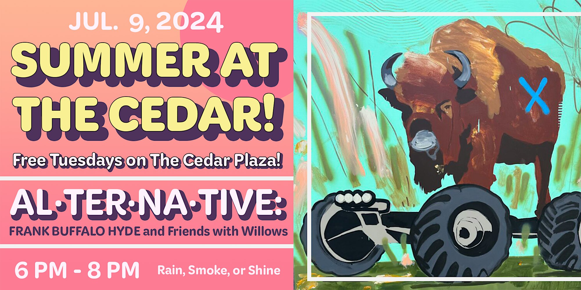 Join us for Summer at The Cedar: a free Tuesday night concert series outdoors on the Cedar Plaza featuring both international and local artists! This evening features Frank Buffalo Hyde and Willows, groups led by local Indigenous artists that draw on folk, blues, and soul traditions. We will be celebrating AL·TER·NA·TIVE, Frank’s solo exhibition with All My Relations Arts, coming to a successful close. Food and beverages will be available for purchase from local vendors and The Cedar, and various community organizations will be tabling.