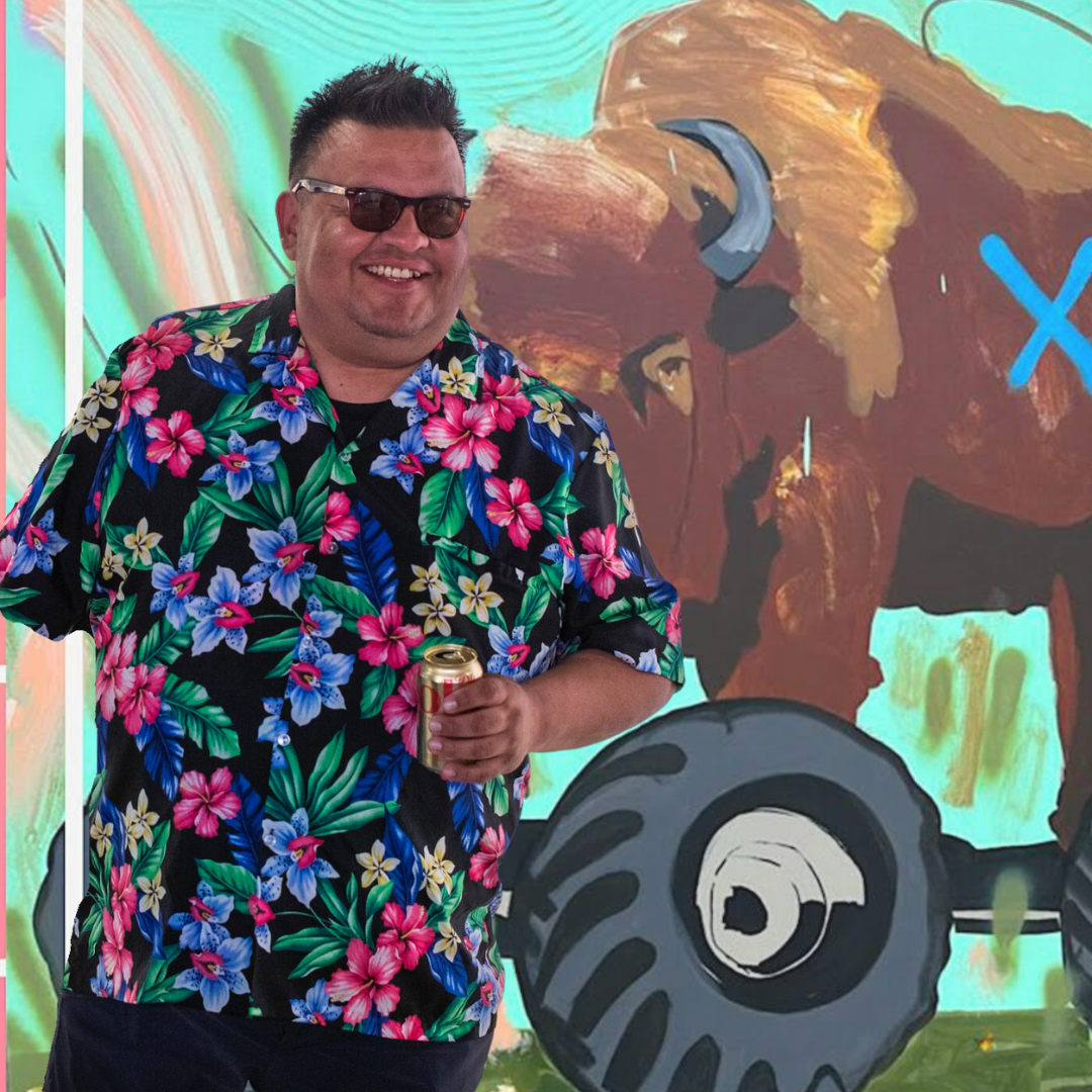 Frank Buffalo Hyde is an Onondaga/Niimíipuu (Nez Perce) artist whose paintings examine and elevate an image of contemporary Indigenous life through a vibrant pop-sensibility and uncompromising satirical eye. His work has been shown at museums including the Wheelright Museum of the American Indian, Santa Fe, NM; the C.M Russell Museum, Great Falls, MT; and Gilcrease Museum, Tulsa, OK. It is in the public collections of the Smithsonian National Museum of the American Indian, Washington DC; Peabody Essex Museum, Salem, MA; Everson Museum of Art, Syracuse, NY; Iroquois Museum, Cobleskill, NY; Longyear Museum at Colgate University, Hamilton, NY; the Institute of American Indian Arts, Santa Fe, NM; the Wheelwright Museum of the American Indian. Hyde lives and works in Northfield, MN.