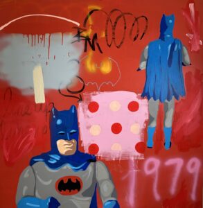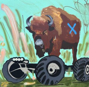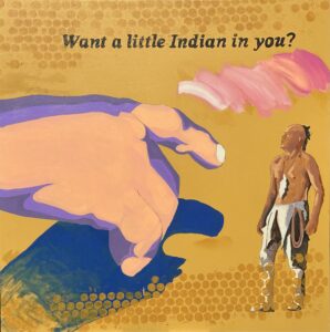 AL·TER·NA·TIVE is a solo exhibition featuring a collection of paintings and sculptures from artist Frank Buffalo Hyde (Onondaga/Niimíipuu (Nez Perce). Vivid and pop-culture saturated, his work reflects on the commodification of American Indian culture, and the assertive roles for Native American identity in the contemporary world. Self-proclaimed as consciously, culturally non-transactional, Frank’s work comments on cultural appropriation and societal disruption through his uncompromising satirical eye. A defiant take on the skewed perceptions of Native American art and culture tourism, Frank’s allegorical work is geared towards Native people first and disarms through banter while making references to antiquated technology in conversation with the metaverse; and provides a layered commentary on the collective unconscious of the 21st century.