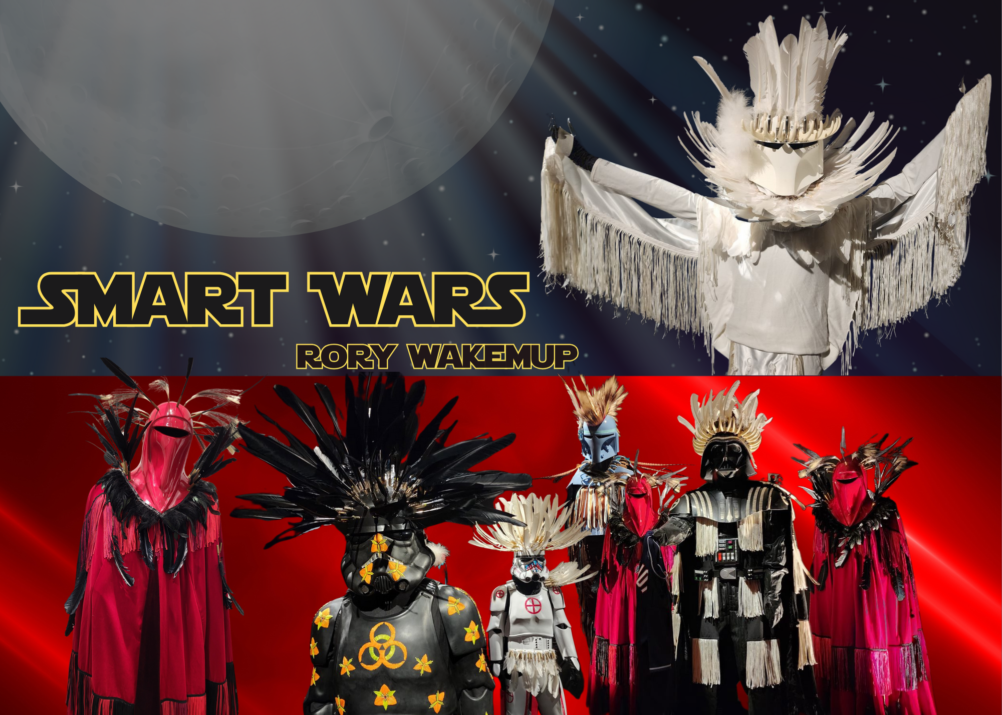 Smart Wars is a flip-the-script, satirical exhibition featuring works that assert Native identity, resilience, resistance, and coexistence with our planet from multimedia artist Rory Wakemup. A continuation of his series, Divest or Die, Wakemup’s work is a tongue-in-cheek exploration of culture vs controversy through sculpture and installation. His exquisitely designed outfits are meant to subvert and amuse while tackling social, political, and climate issues. Infusing traditional methods and materials, Wakemup’s regalia is designed for 21st-century Indian warriors in the battle to reawaken Indigenous ancestry on planet Earth.