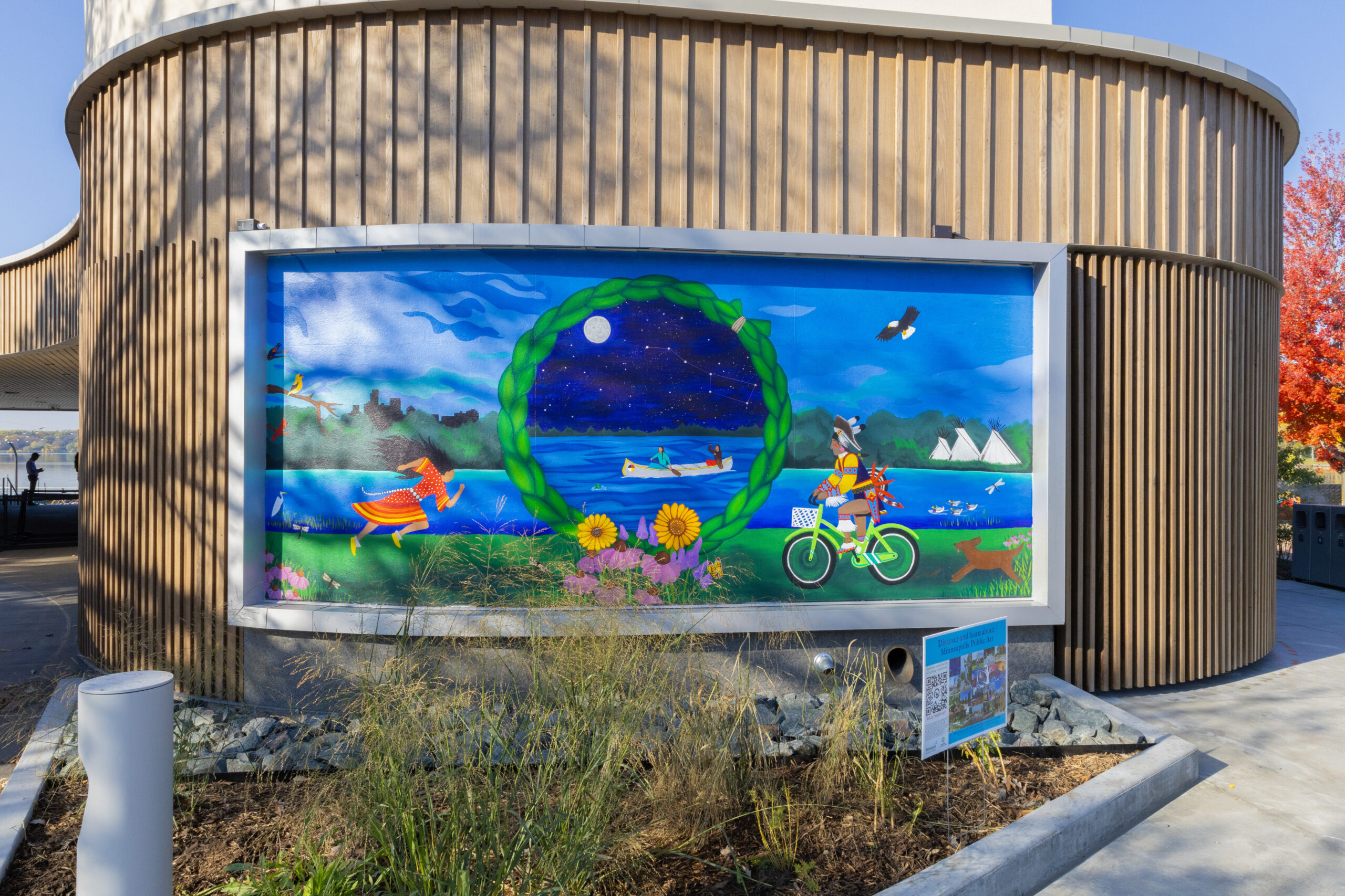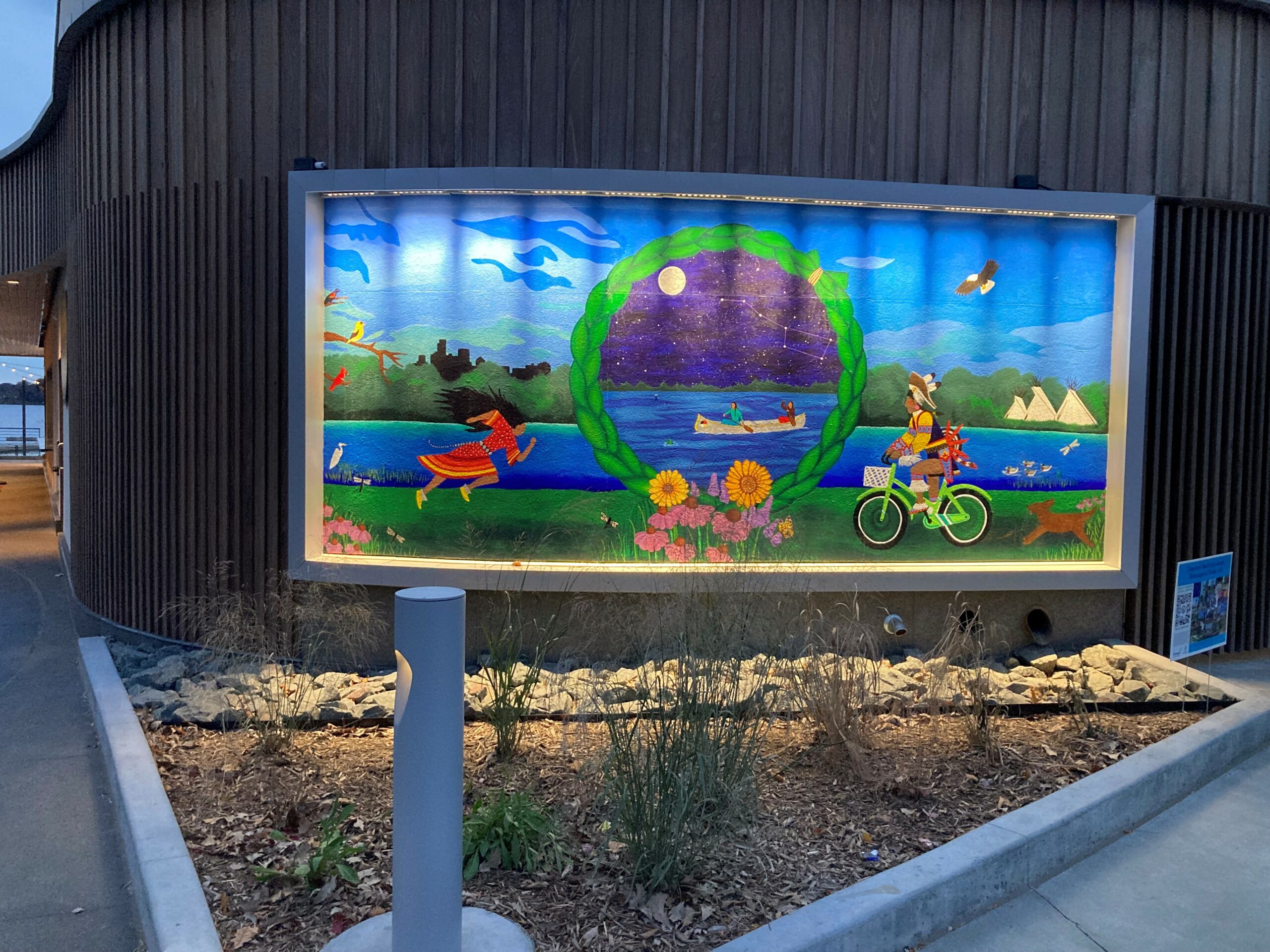 The mural located on the shore of Bde Maka Ska is a celebration of Indigenous health and well-being. The water, earth, plant medicines, and the cosmos inform our worldviews. It features running, biking, and canoeing. The cityscape honors today’s large urban Native community, while the tipis recognize the ancestral homelands of Dakhóta Oyate and the village of Maḣpiya Wic̣aṡṭa (Cloud Man) which was once along the lakeshore.The design of the mural was influenced by a public survey, where participants expressed their desire to see floral and fauna of the area, scenes of health, and a way to honor Native people.